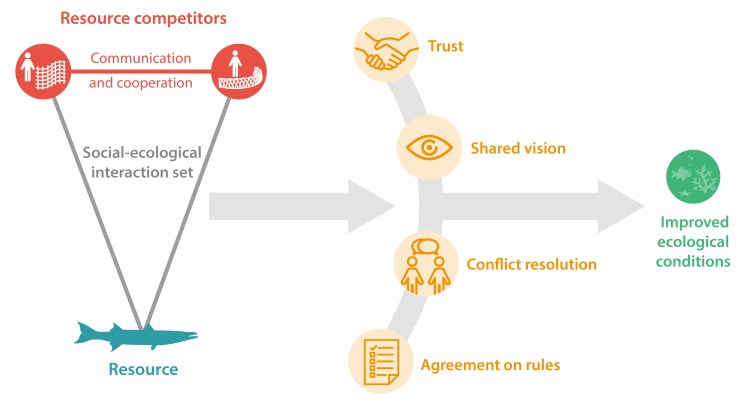 Fig. 2 from Barnes et al. 2019 Nature Communications. A conceptual diagram illustrating key social processes theoretically supported by social–ecological network closure that may lead to improved ecological conditions in the commons. When direct resource competitors in settings characterized by strong and complex patterns of social–ecological interactions form cooperative communication ties, it lays the foundation for the emergence of trust, a shared vision, and sustained commitments regarding the management of shared resources. Two examples of such commitments include the development of conflict resolution mechanisms and agreement on rules. In this paper, we found suggestive evidence that these social interactions and processes can ultimately lead to improved ecological conditions.